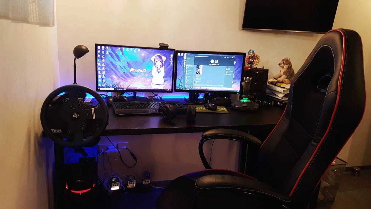 Pour l'information matériel je travaille sur un ordinateur pré-monté Asus rog ( intel core i7-7700 8 cœurs en 3.6GHz / carte graphique NVidia GTX 1050 / 16 GO ram ) j'ai un double écran (asus & samsung) avec un clavier Razer ornata v2 et une souri Razer naga trinity, une manette logitech F310, joystick Thrustmaster T.16000M, un volant t150pro feedback et le plus important, un casque dernière génération Plantronics RIG 800HD munis de la technologie Dolby-Atmos. J'ai aussi une tablette graphique Wacom CTL-671 et j'utilise les webcam de la marque logitech.