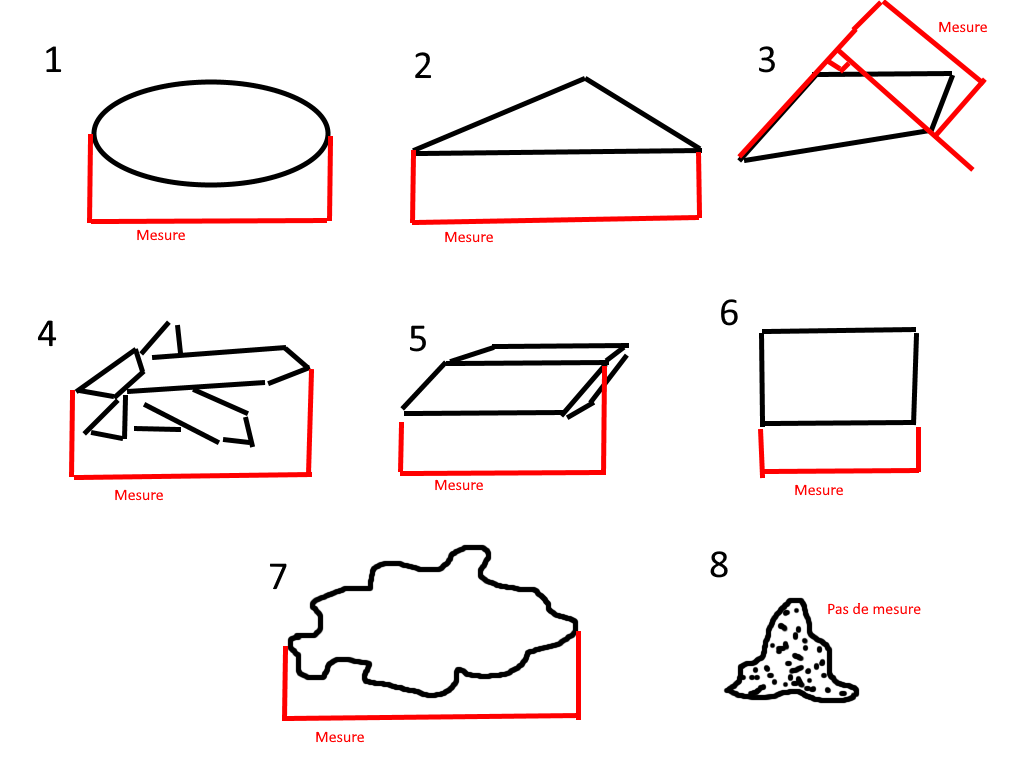 3: pour tout spécimen à faces quelconques, la mesure se fait à partir de la base la plus large qui ne se trouve pas sur la longueur et donne la plus grande mesure obtenu.