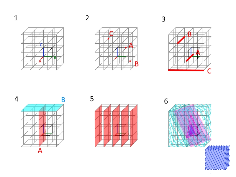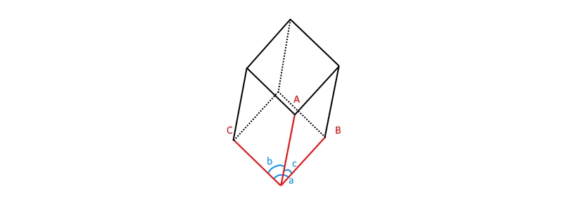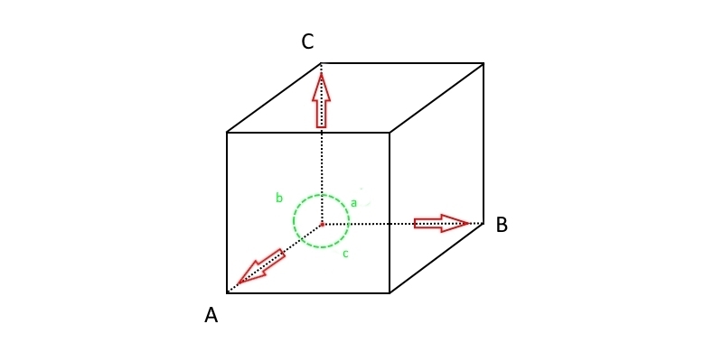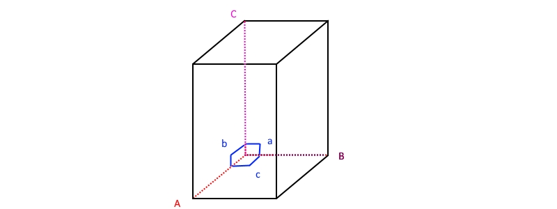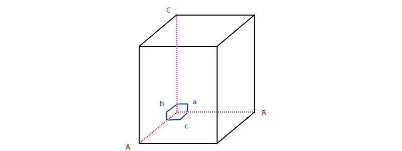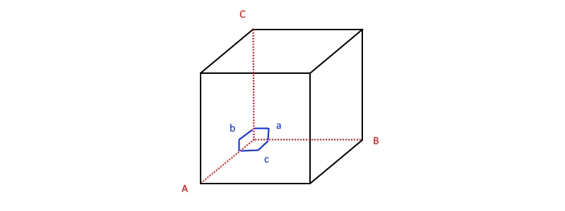 On peut alors prendre n'importe quelle maille dans l'espace. Cette maille sera donc positionnée de façon normée, avec les vecteurs A, B et C valant 1 (figure 1) et aura pour origine le croisement de ces trois vecteurs.
