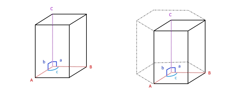 La cristallographie se construira alors sur ce modèle au plus simple. Il sera défini par 3 de ses côtés fuyant du même coin (appelés vecteurs), ainsi que par les 3 angles de fuite de ce même coin. On retrouve alors le premier schéma de maille.