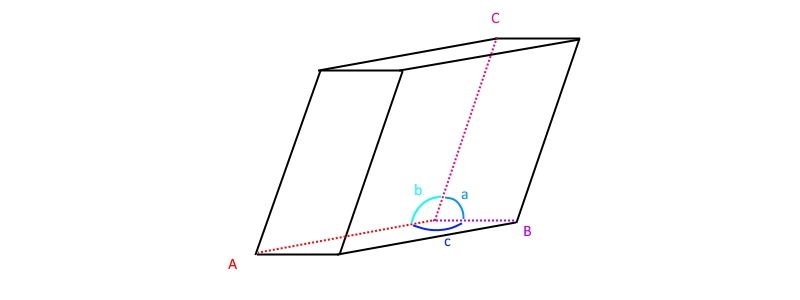 La description de cette maille se fait de façon normée, toujours sur le même schéma présenté ci-dessus. [On peut utiliser les 3 premiers doigts de sa main droite écartés pour représenter les directions des trois vecteurs A, B et C. Cette direction sera conservée quel que soit la rotation prise. Les angles a, b et c tournent toujours autour de ces axes et se présentent donc sur un plan perpendiculaire.]