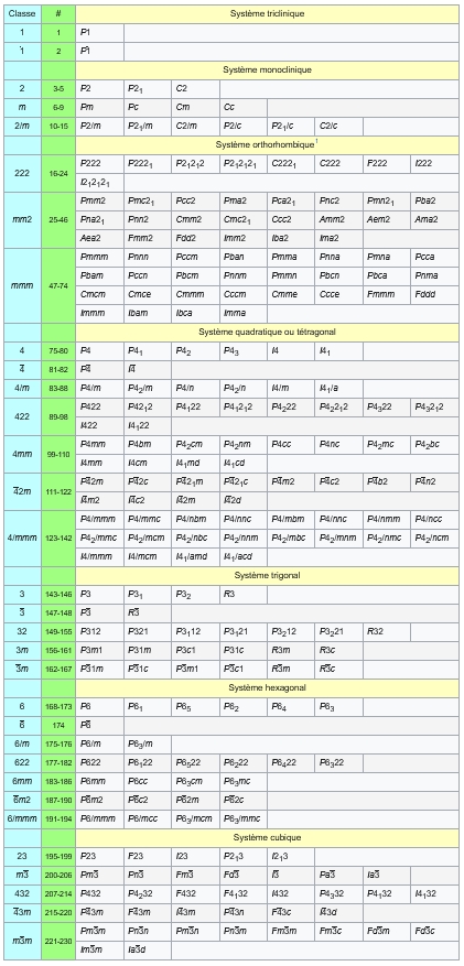 Sans avoir à retenir cette norme, il est uniquement important de se mémoriser que ces symétries vont scinder les 7 grands groupes cristallins en 32 types de groupes ponctuels et 230 groupes d'espace.