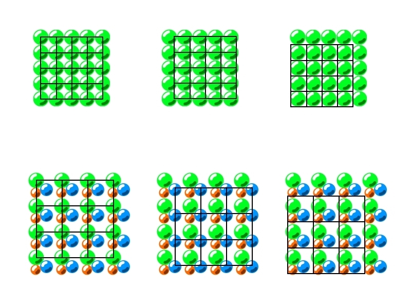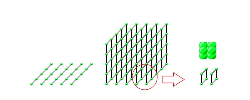 Partant de cette simplification grossière, la maille la plus petite peut alors se mettre sur n'importe quelle échelle et n'importe quelle position dans la structure. Il est alors possible de résumer la maille à sa plus simple identité d'espace cubique.