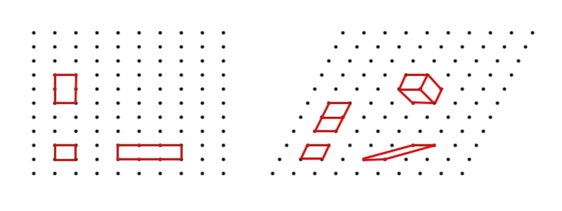 De ce fait, on peut voir que, quel que soit le motif présent dans la maille, on peut baser les nœuds de la maille n'importe où sur ce dernier, tant que le respect de répétition est maintenu comme sur ce schéma :