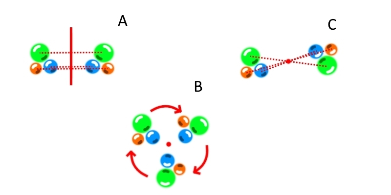 - La symétrie la plus simple est la symétrie de réflexion, tel un miroir, c'est un plan passant par le centre, tout ce qui se trouve d'un côté sera donc inversé de l'autre côté comme la figure A. Cette symétrie s'écrit "m"