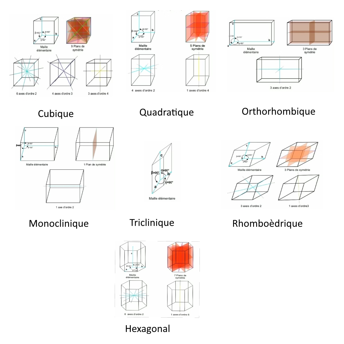 À noter que les cristaux, en fonction de leur point d'observation, peuvent avoir une maille orientée dans des directions différentes de celles présentées, mais elles se retrouveront toujours dans ces catégories.
