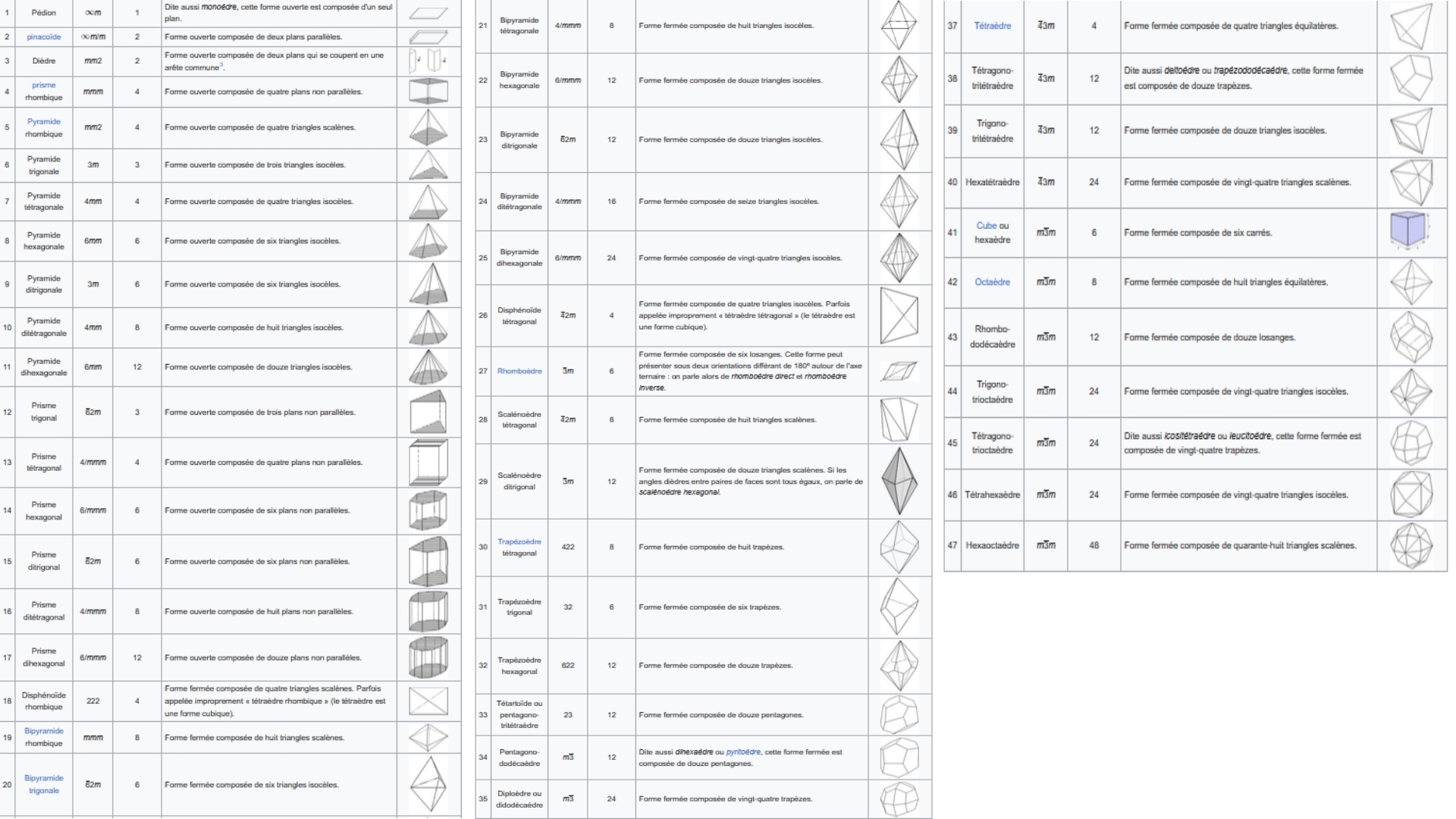 La liste de possibilités de formes possibles pour les cristaux est alors très longue.