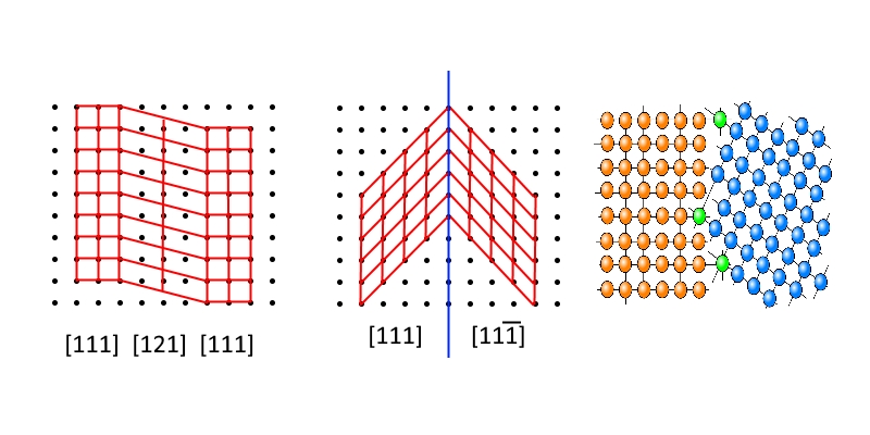 Sans rentrer dans les détails, on peut également utiliser les principes ci-dessus pour expliquer les déformations cristallines, par exemple suite à des impuretés, ou les macles, changements d'orientation symétriques (expliqué plus bas dans le document).