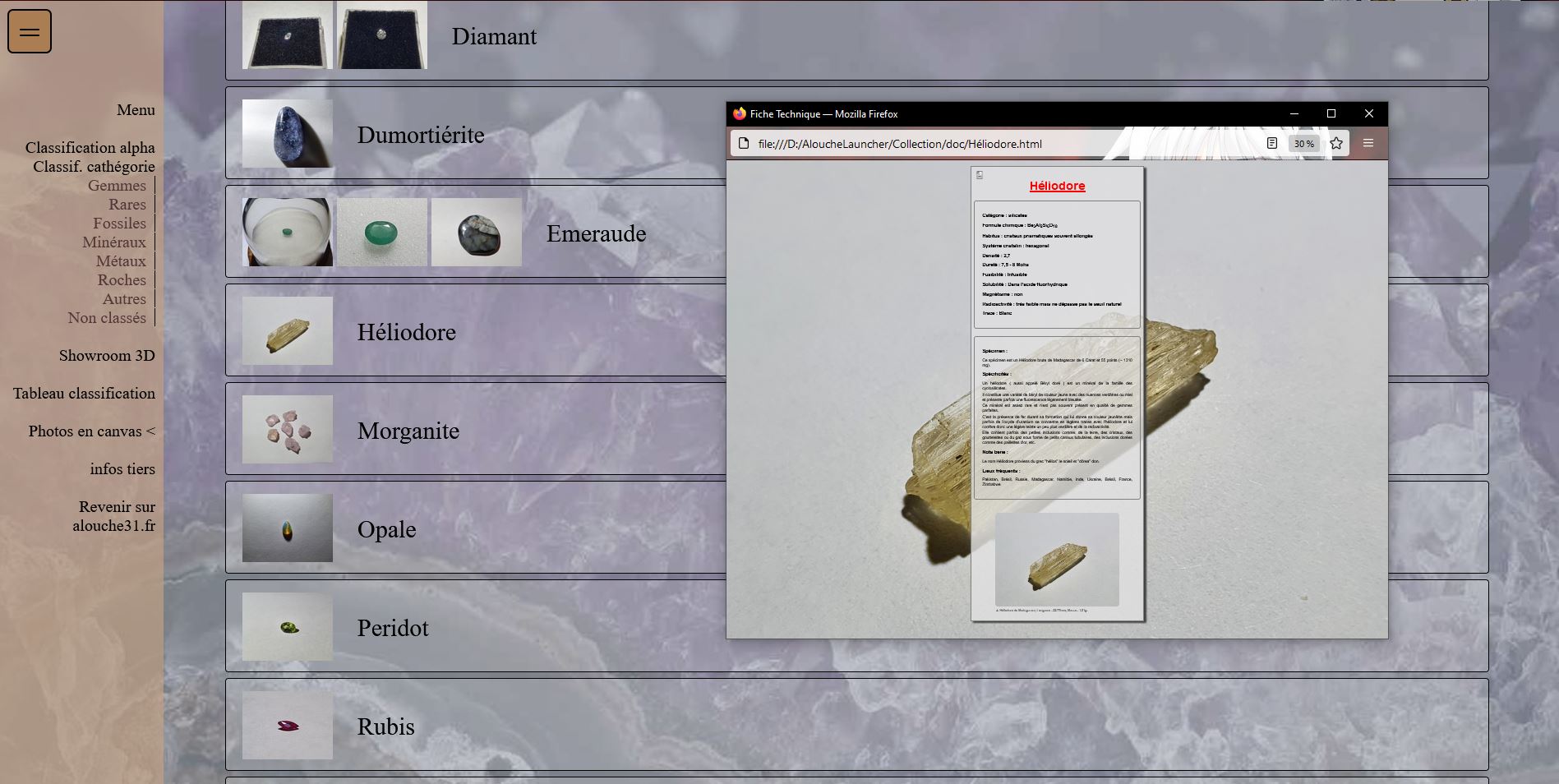 En cliquant sur collection et fiches le site vous renvoie vers la seconde partie qui propose une liste non exhaustive de minéraux du monde présents dans ma collection privée. Vous aurez de magnifiques images ainsi que des fiches de vulgarisation très détaillées sur les minéraux pour compléter votre savoir ou si vous cherchez des informations précises sur des minéraux sans perdre votre temps sur internet.
